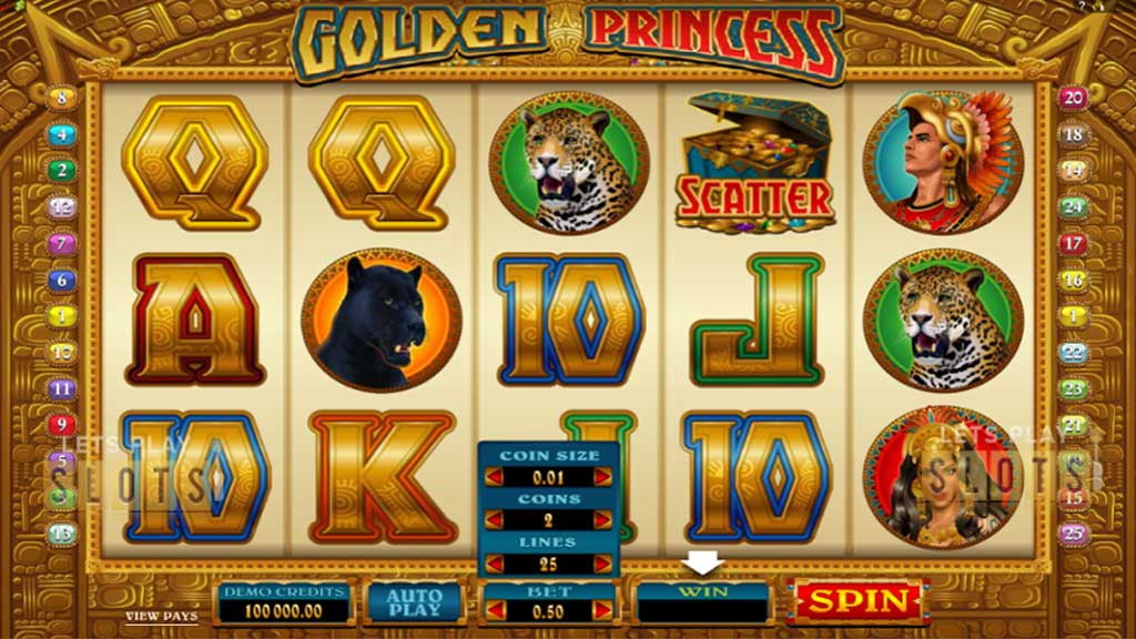 Golden Princess is a penny slot so you may bet only $0.01 if you wish, and for that you’ll get only 1 of 25 paylines. To play all 25, the minimum bet per spin is $0.25, and the maximum possible bet per spin in this game is $125. It will take quite a bit of cash to play Golden Princess successfully with a $125 bet, and players are advised to choose their bet carefully since you need to be able to pay for a large number of spins in order to get the best of Golden Princess.