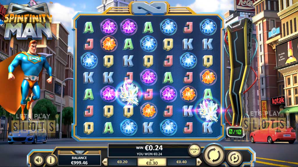 When Spinfinity Man himself, a 2×2 symbol, appears fully on your reels, one of five super powers will activate and bring you big wins. Laser Eye Beam will burn away two rows or columns, and Double Laser Eye Beam will burn away two rows and two columns. Icy Blast will shatter a small cluster of symbols, and Double Icy Blast will shatter a large cluster. Telepathy is the final feature, and it will remove an entire single symbol from the reels. All these features have the same effect, they’ll remove some symbols and give you a chance to form new winning clusters.