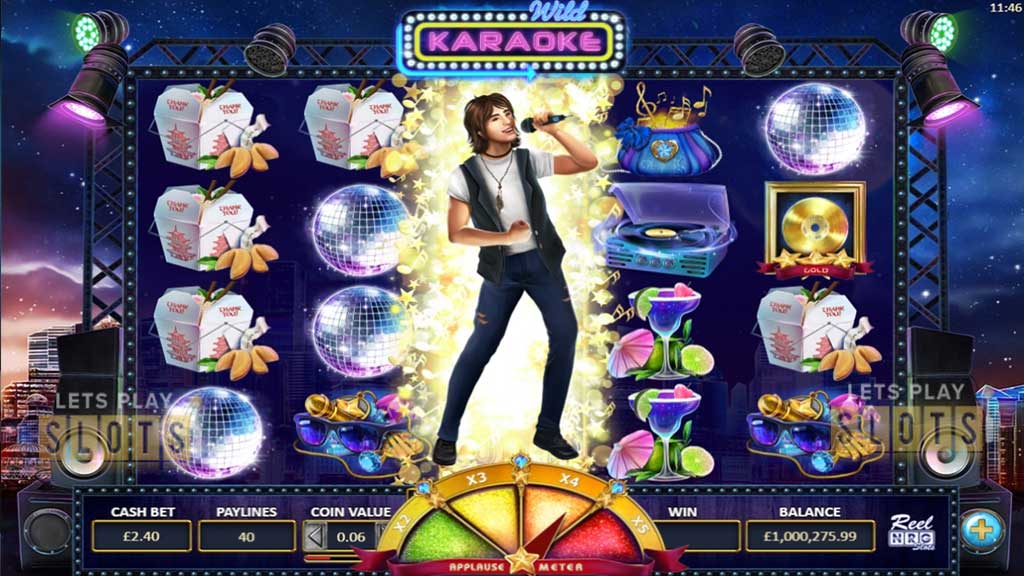 The stacked Wild symbols appear on reels 2, 3 and 4. Randomly, if two Wilds land at any position, one, two or all three stacked Wilds can be nudged to expand to cover the full reel. That means you can have up to all three middle reels Wild. Also, when the Nudging Wild feature is activated, you can get a win multiplier between x2 and x5 which is actually the Applause Meter for the guy or girl singing karaoke. Fun stuff.
